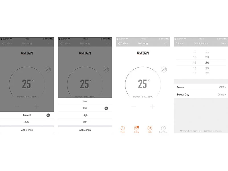 - Kostenlose App “Elesion” für iOS und Android, erhältlich im App Store und bei Google Play: für Ein- und Ausschalten, Einstellen der Wunsch-Temperatur, Stufenwahl, Timer-Einstellungen